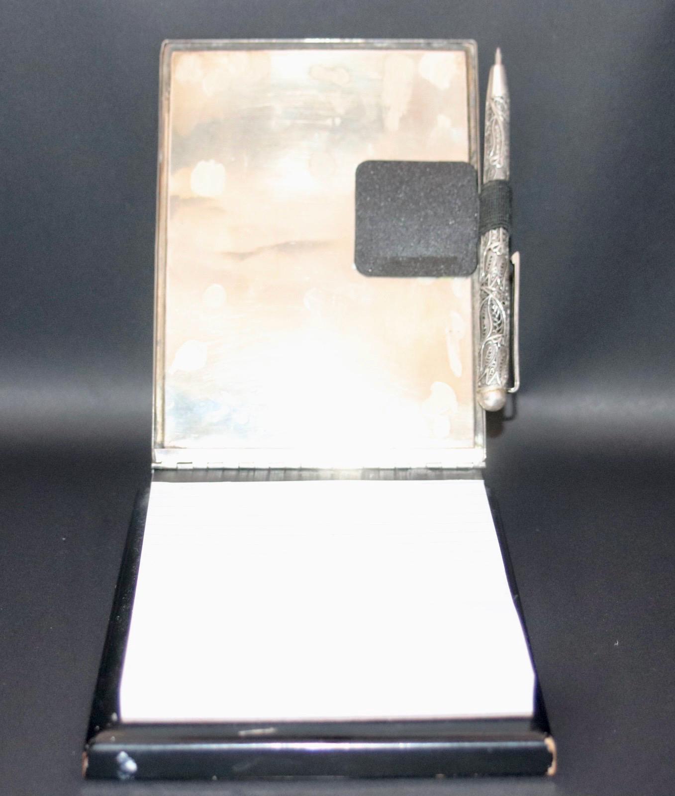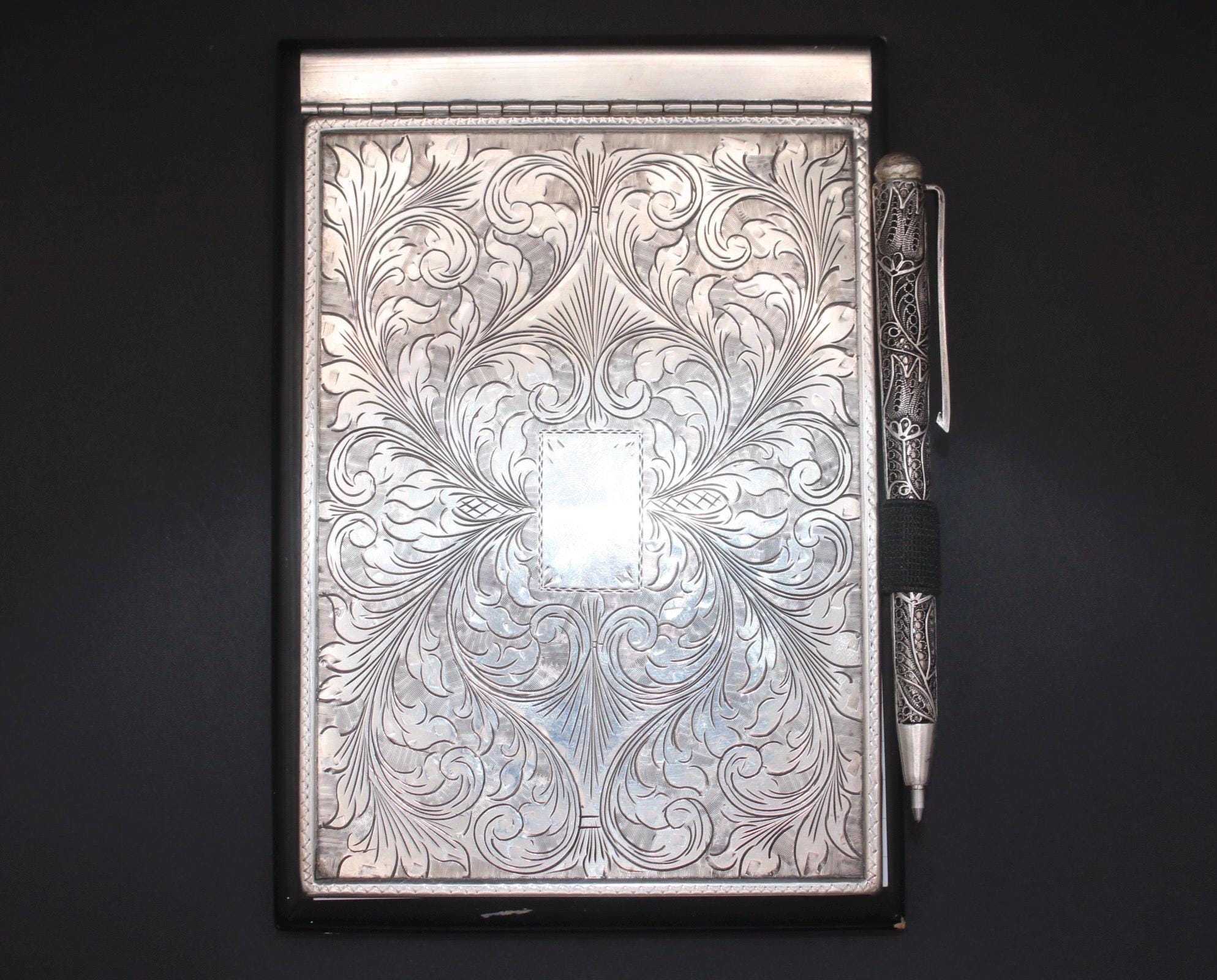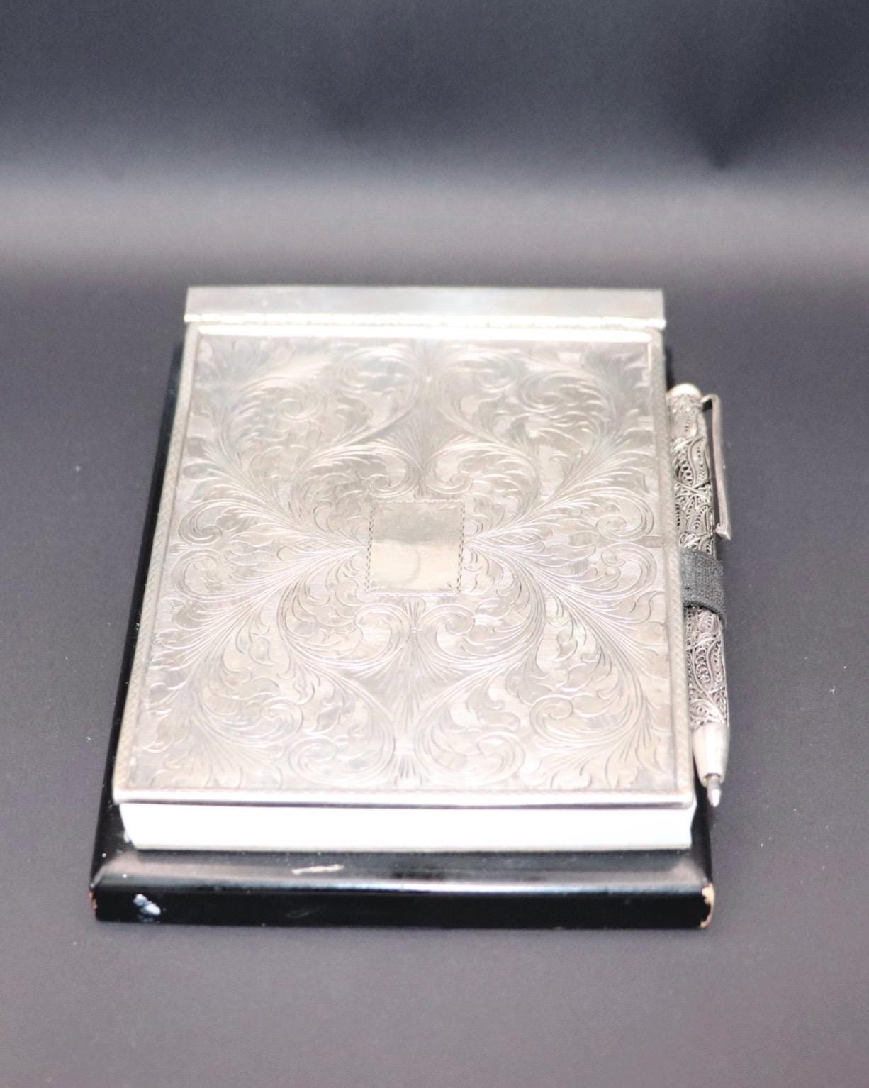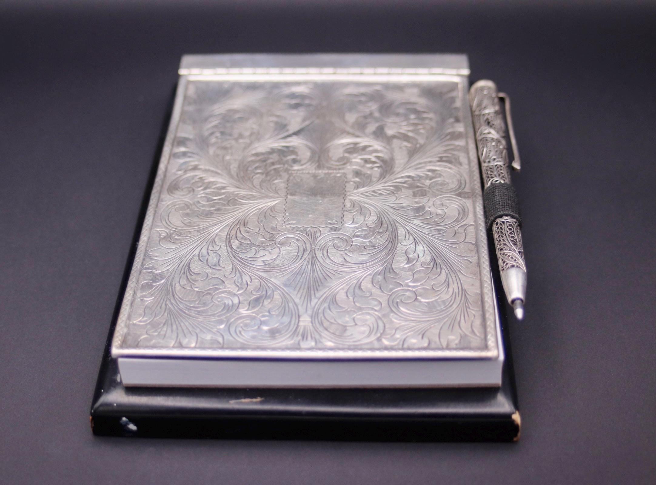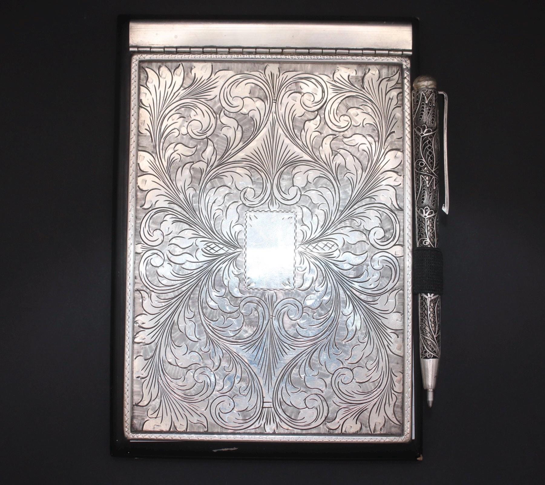 The notebook cover is made of finely engraved 800 silver with a solid dark wooden base on the silver lid is place for a monogram . in combination a beautiful and elegant addition to any workplace .