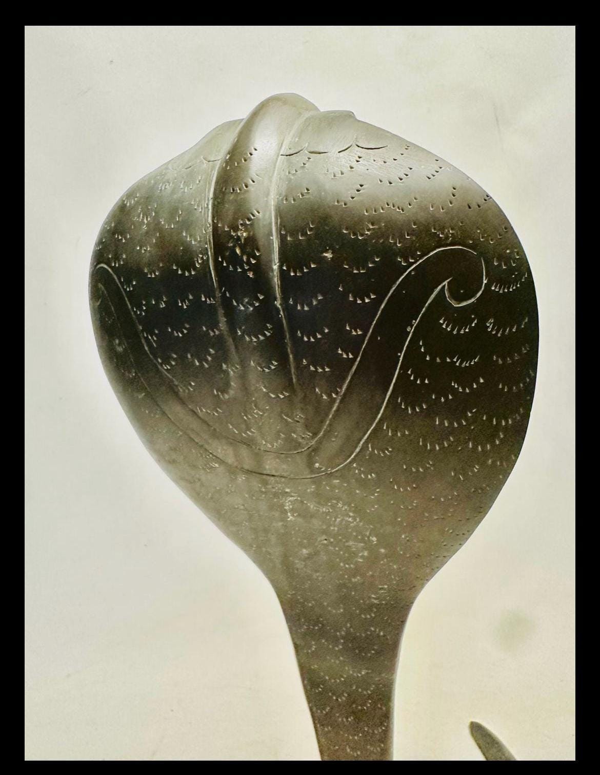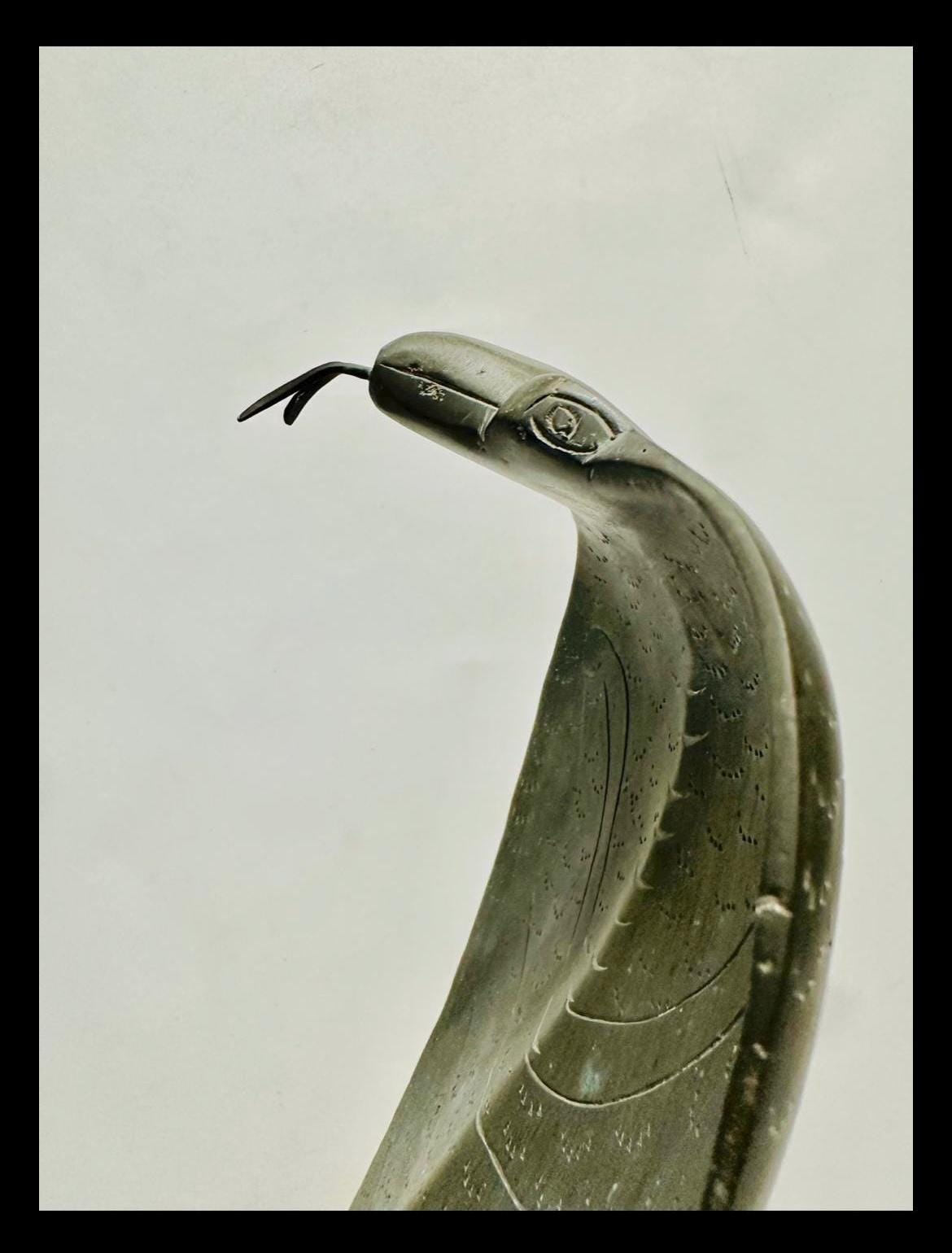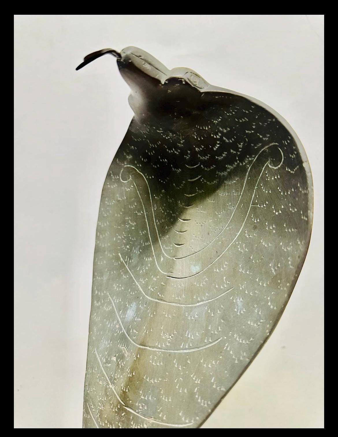 Antique Cobra sculpture crafted from solid brass, featuring an upright hooded cobra in a striking pose. Finely engraved surface details highlight the texture of scales and hood patterns. The piece likely originates from India and dates to 1950s. A sacred piece of work symbolizing protection and power in Indian culture.