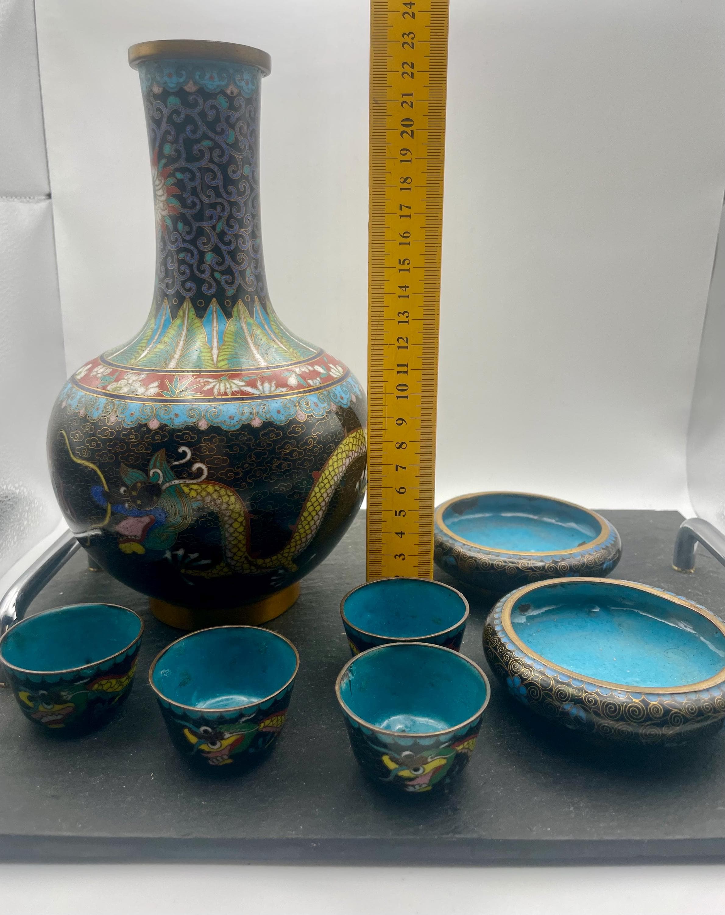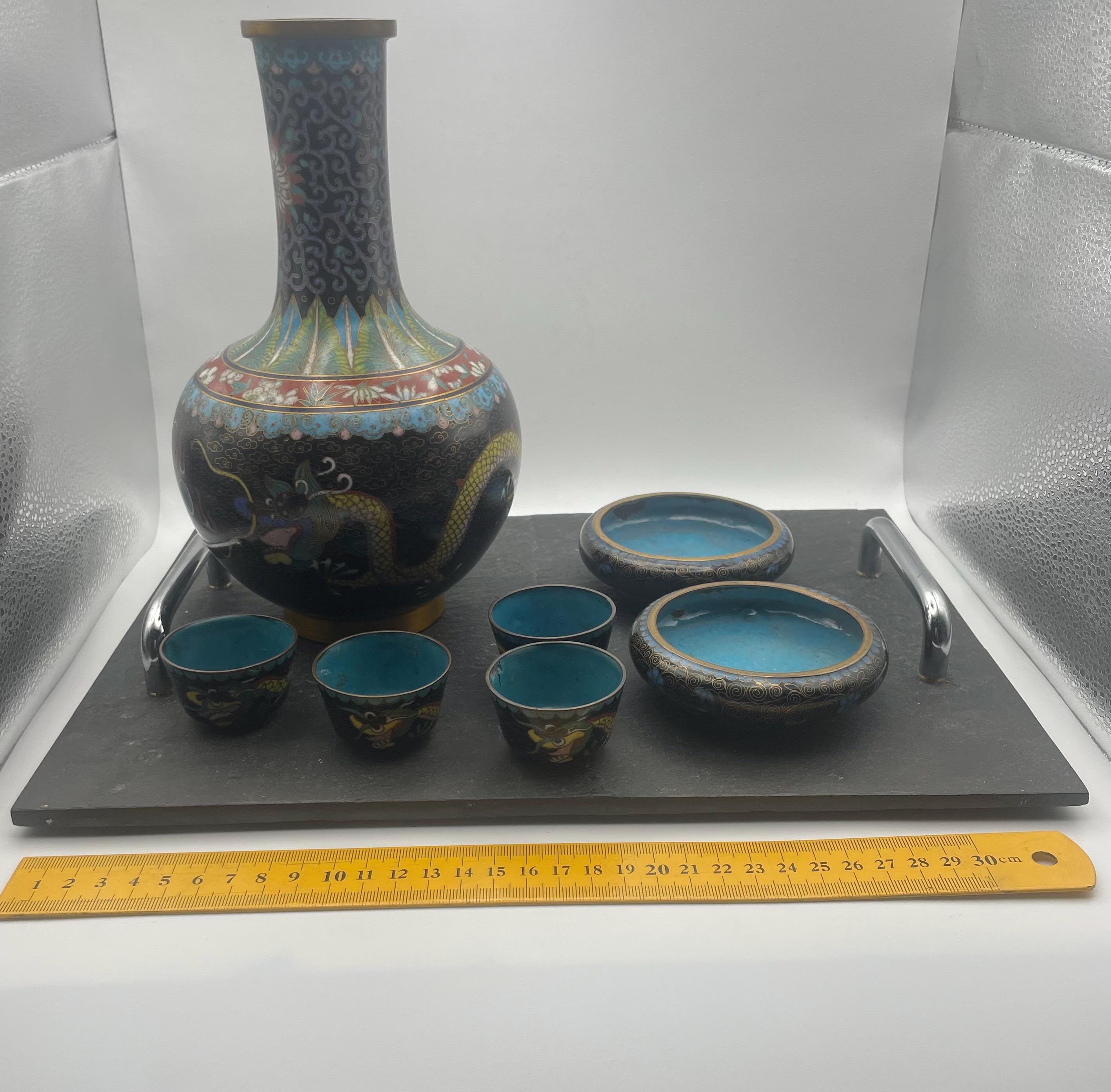 Chinese Cloisonne Dragon Bowl, and decanter set with two bowls on a slate tray early 20th century
