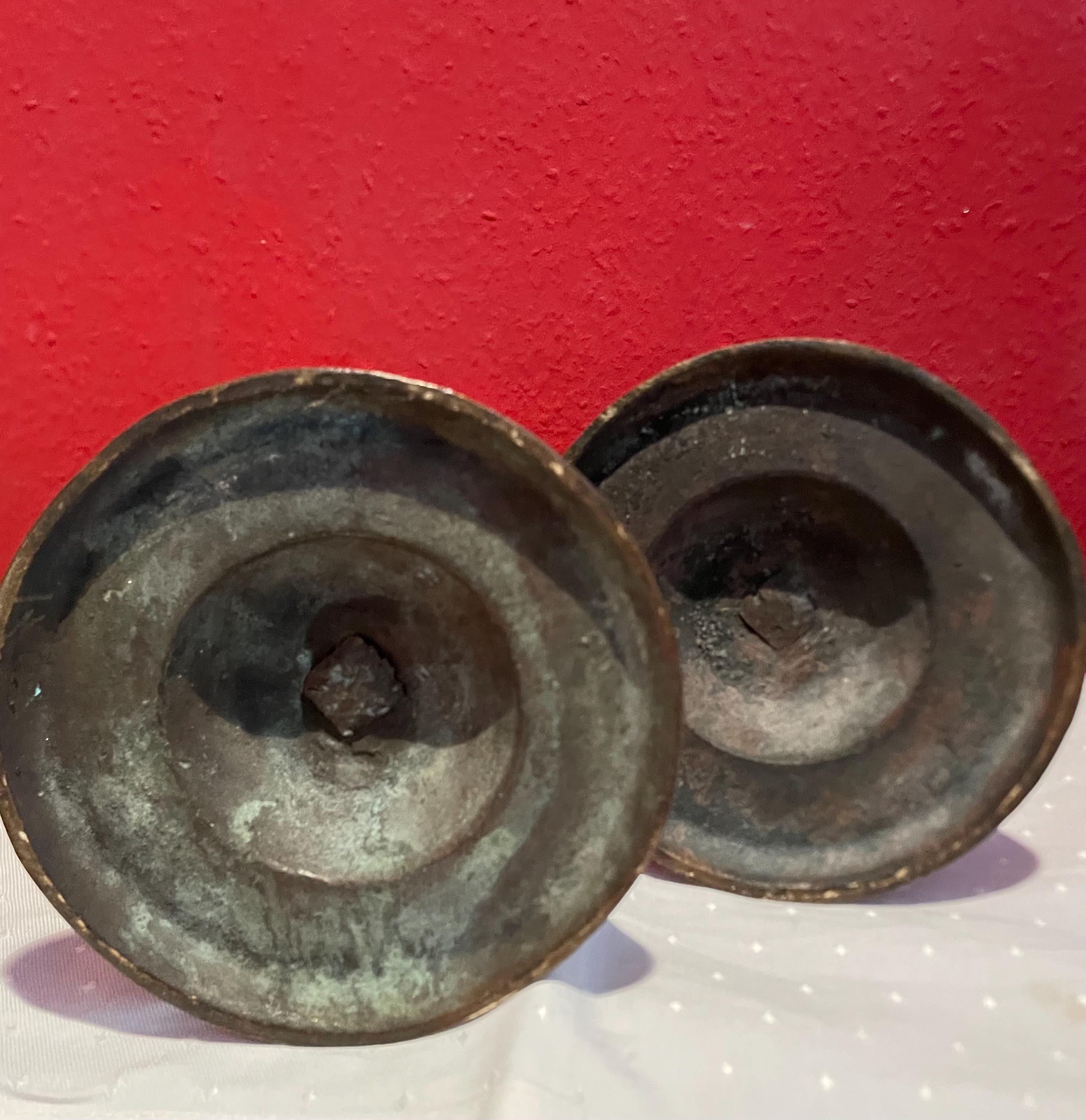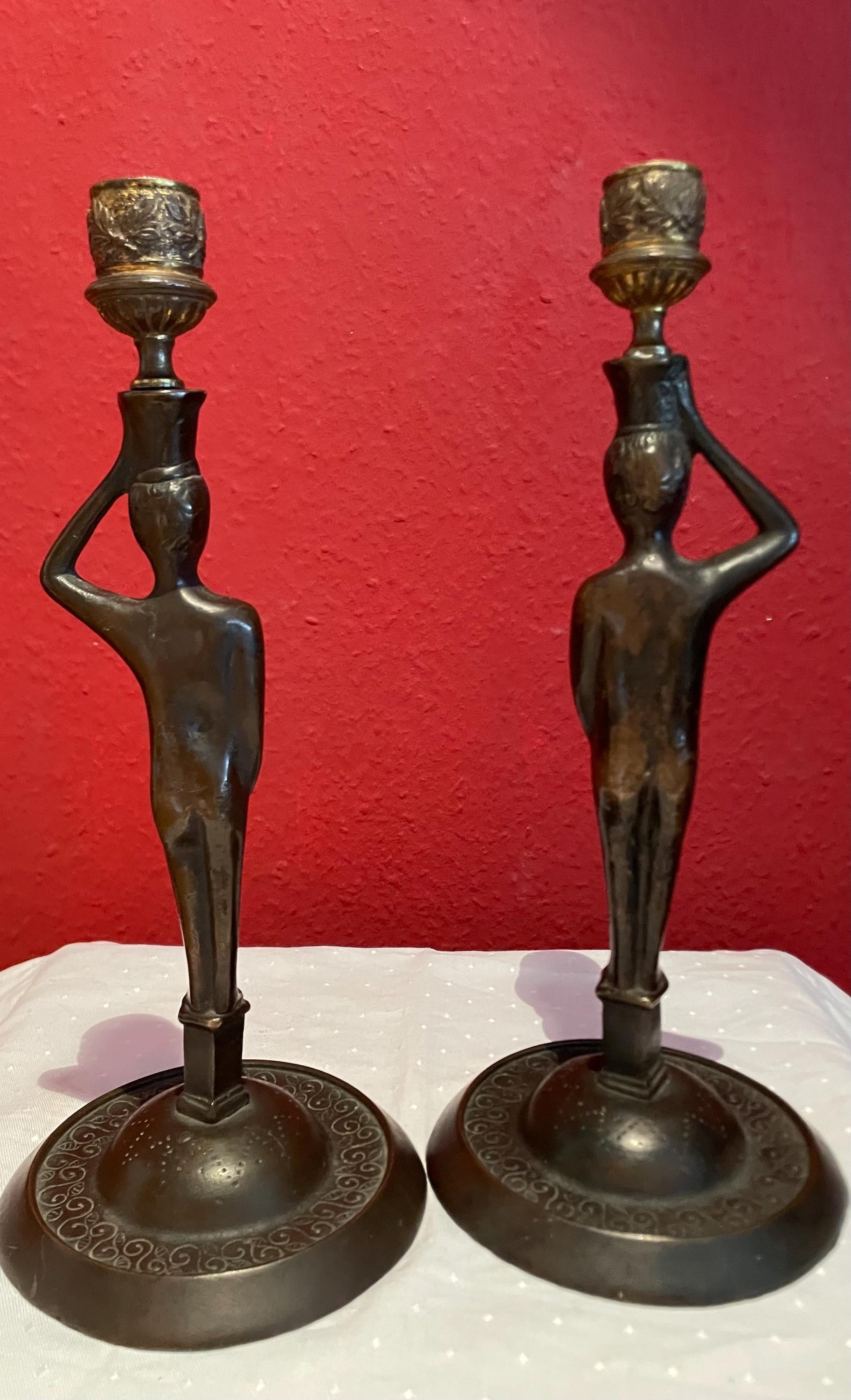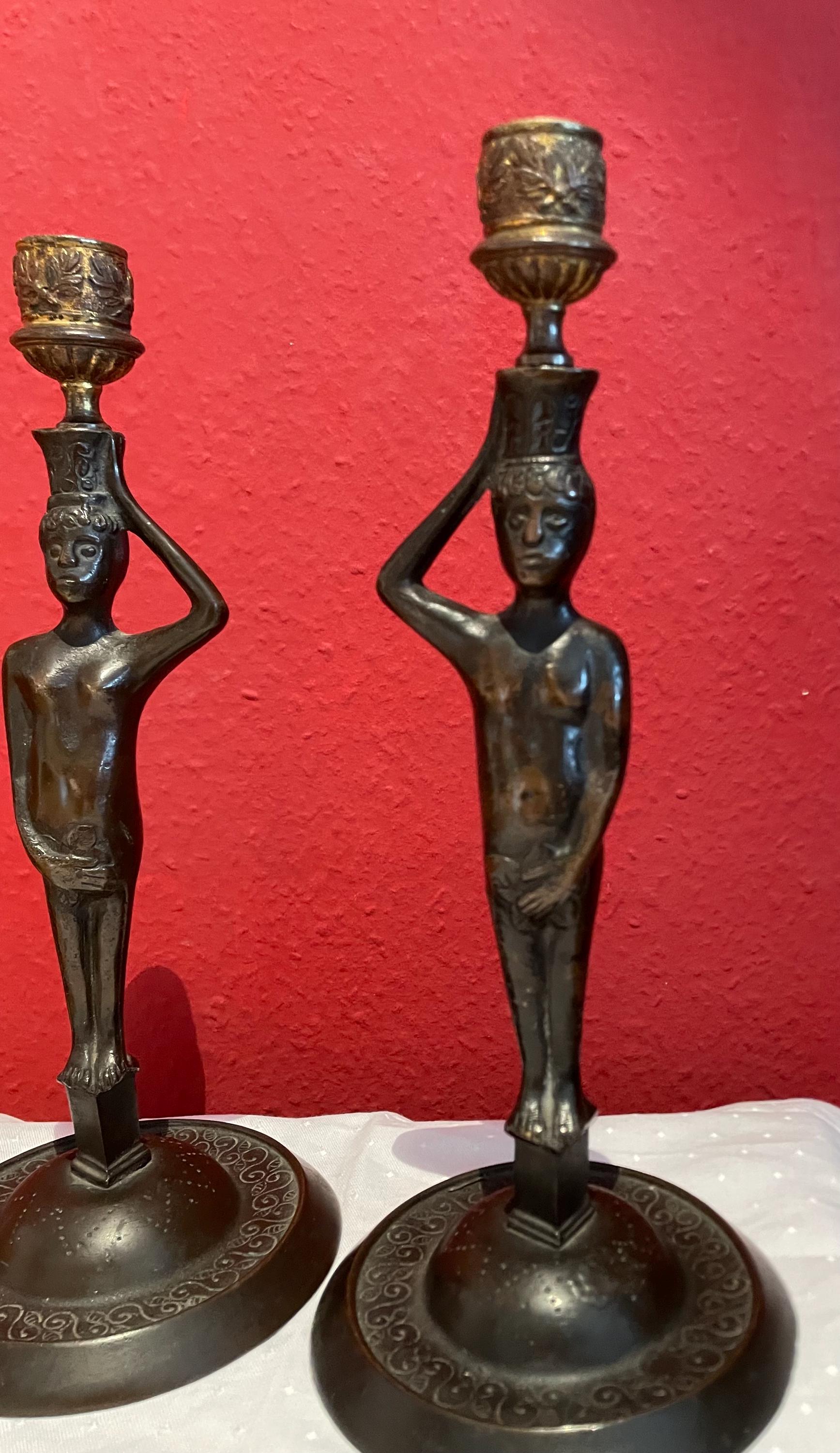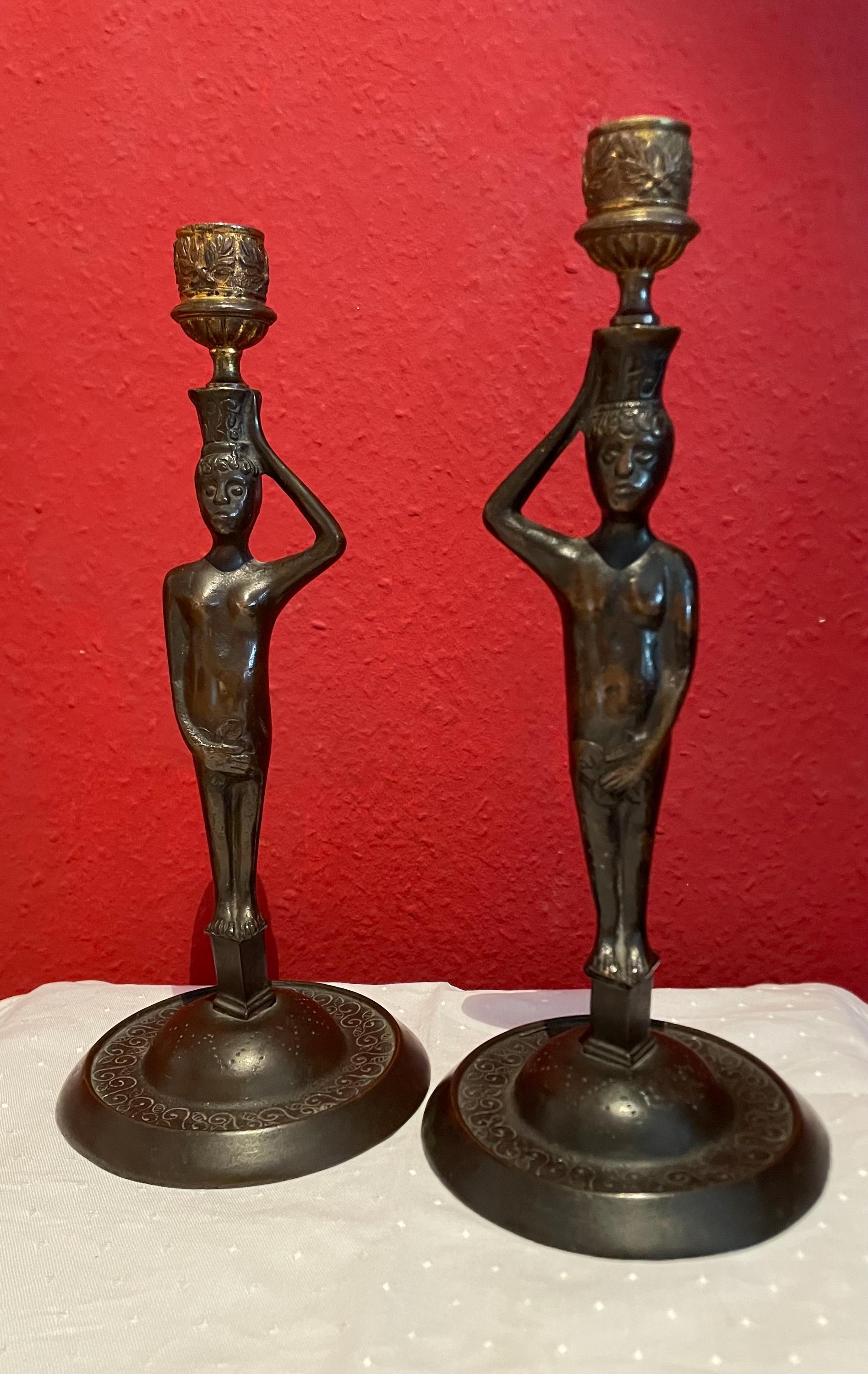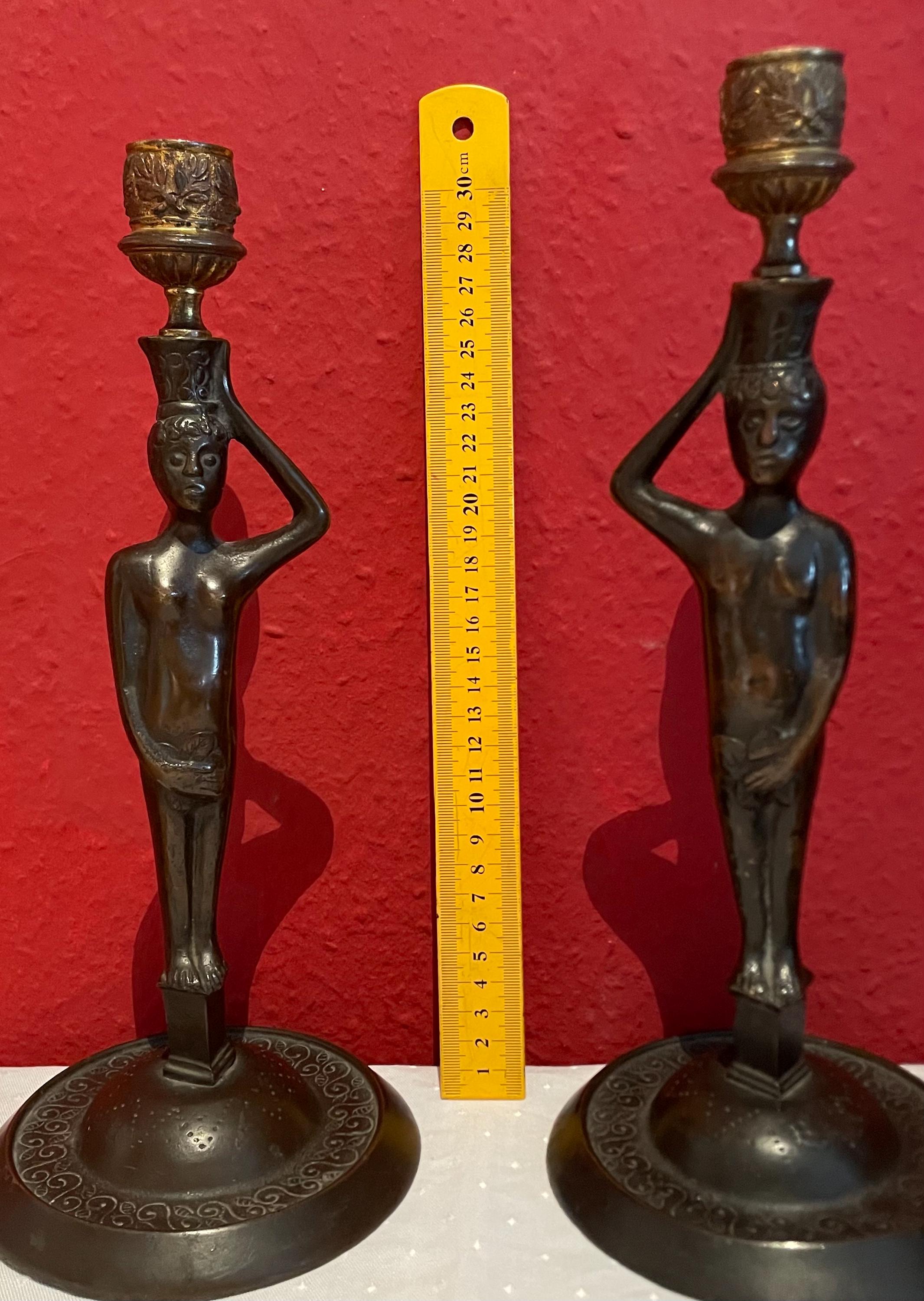 Beautiful antique candlesticks depicting Adam and Eve, nude with a fig leaf covering their modesty. They are from the late 18 early 19th century, with beautiful cast work that is riveted onto the pedestal. The pedestal features stamped decoration. They have a lovely original patina. Unfortunately, the blueberries have been replaced. The candlesticks are 26.5 cm and 26 cm tall.