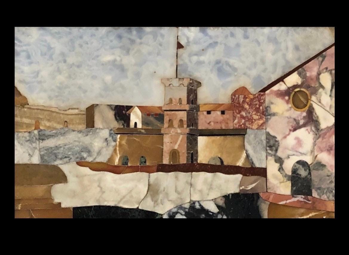A finely executed pietre dure (hard-stone inlay) panel depicting an architectural capriccio, composed of carefully cut and fitted sections of variegated marbles and hardstones, including alabaster, breccia, and coloured stone, arranged to form an imaginary classical landscape with walls, passages, and architectural elements. The natural veining and tonal variation of the stones are skilfully exploited to suggest depth, texture, and age.